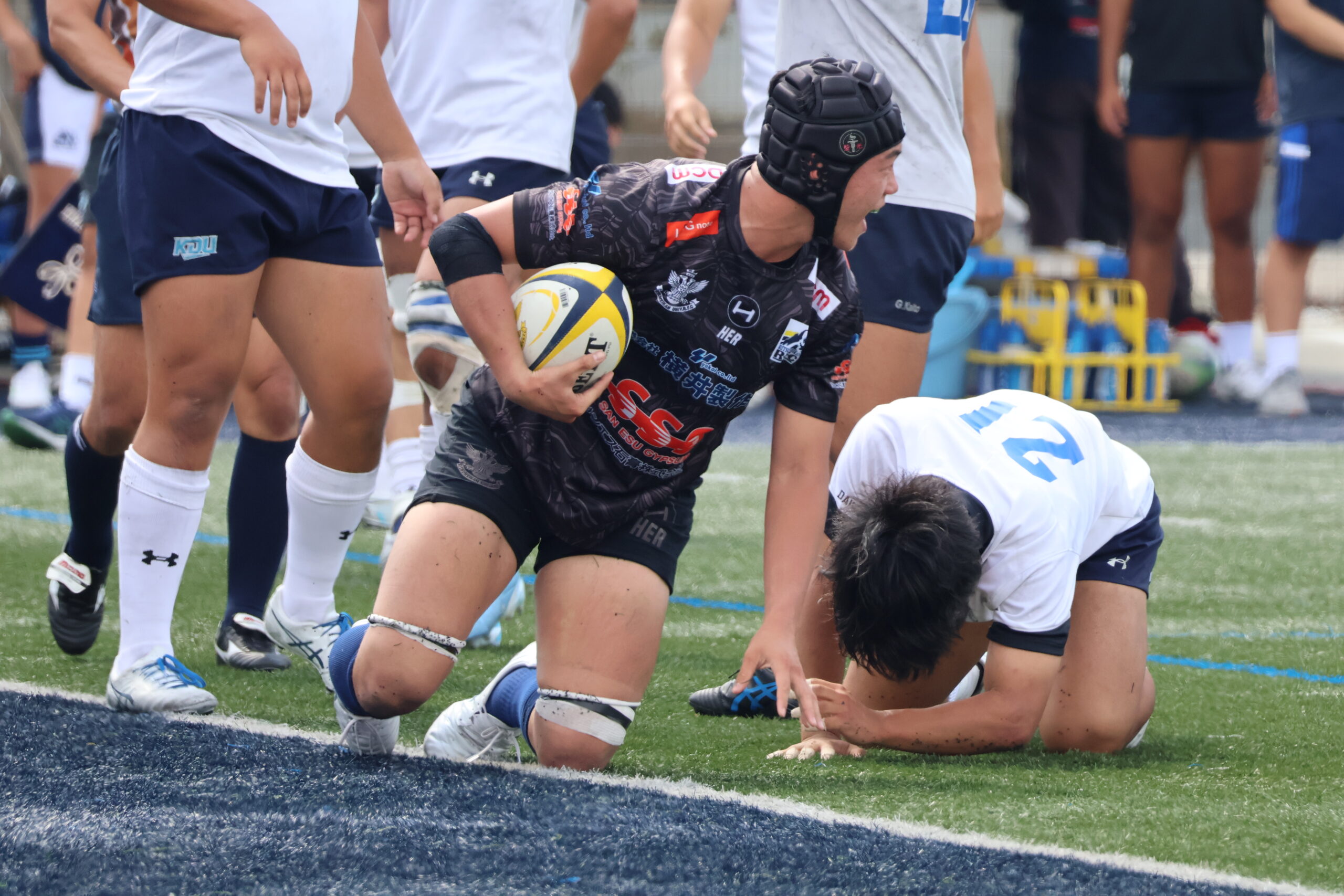 前半10分、敵陣22m付近まで攻め込み10初田のキックパスでゲインし、最後は12大村が押し込んで、トライ。10初田のキックも成功し、逆転します。