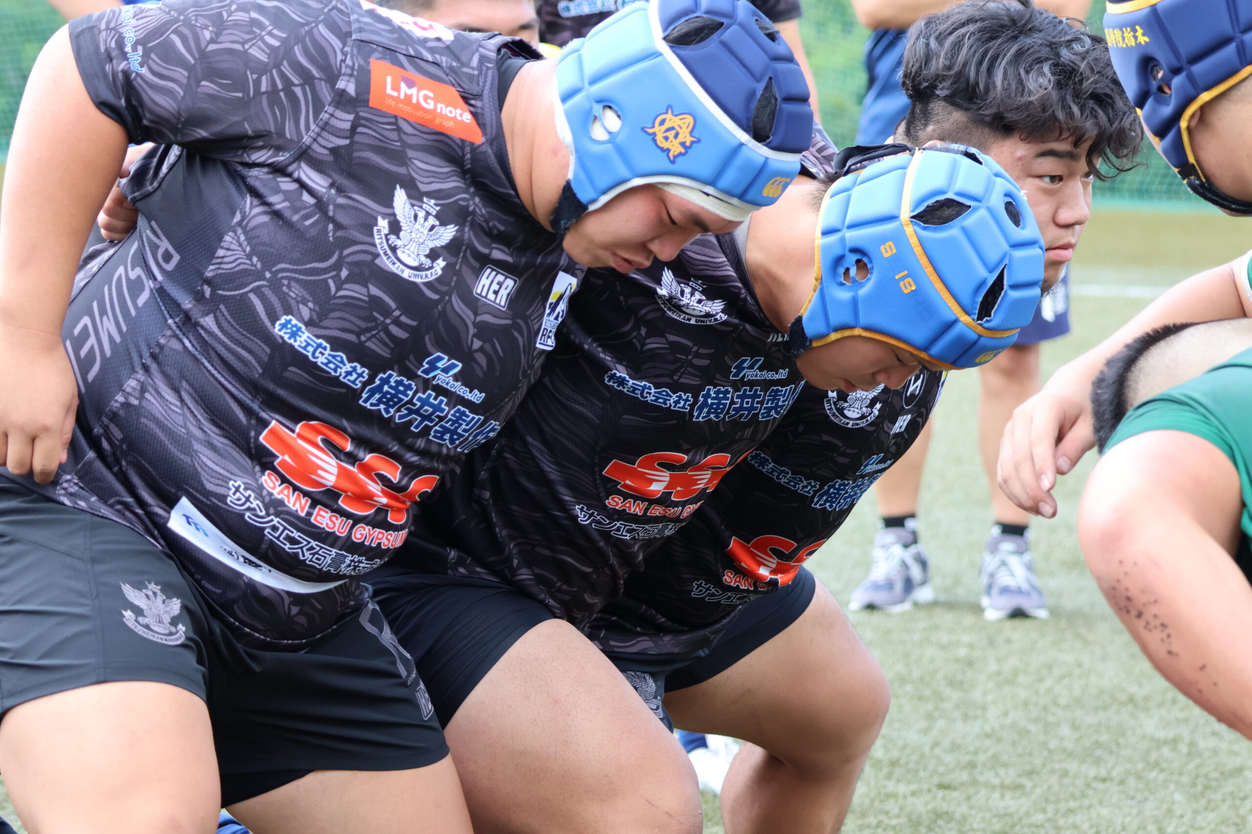 最初にチーム内でスクラムを組んだ後、レフリーの方のもと専修大学の選手とスクラムを組みました。スクラムの強化を目標に掲げているため、時間をかけて何度もスクラムを組み直していました。