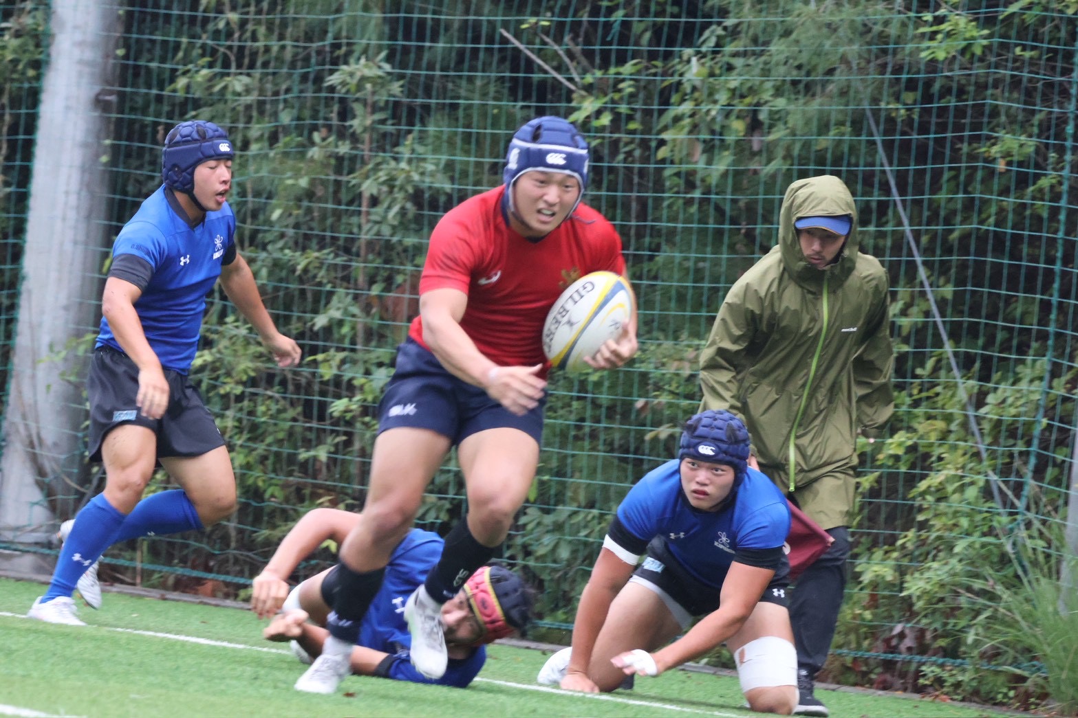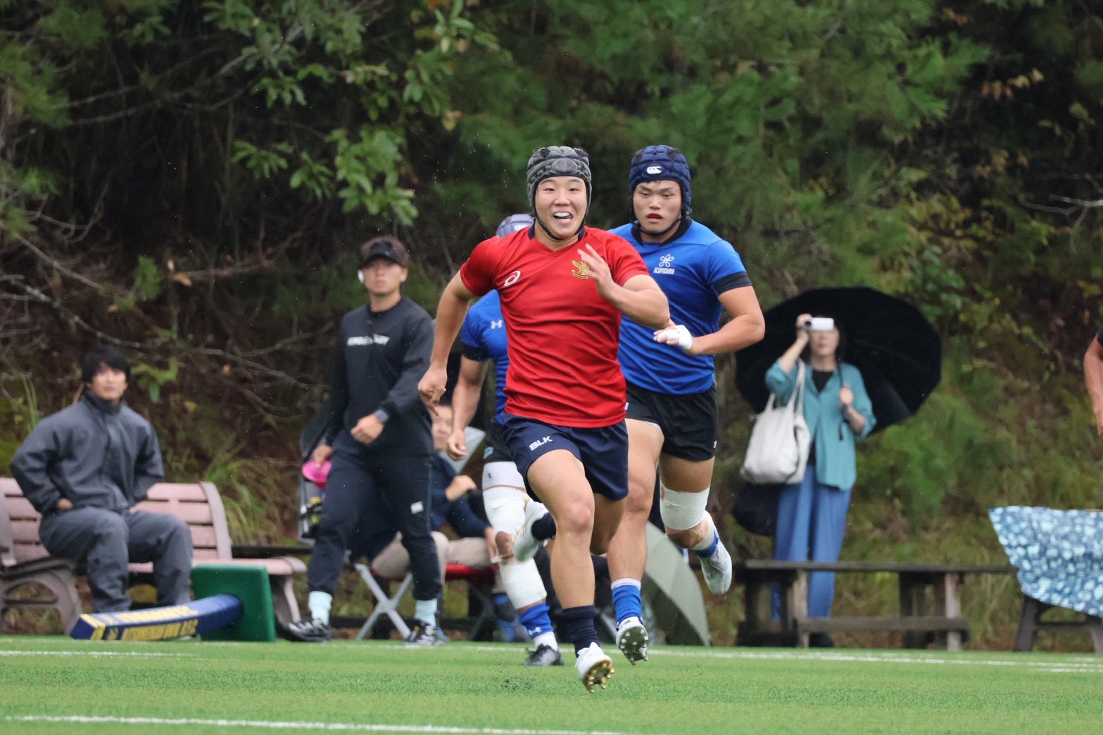 あいにくの雨の中、13:30分に立命館のキックオフで試合開始です。