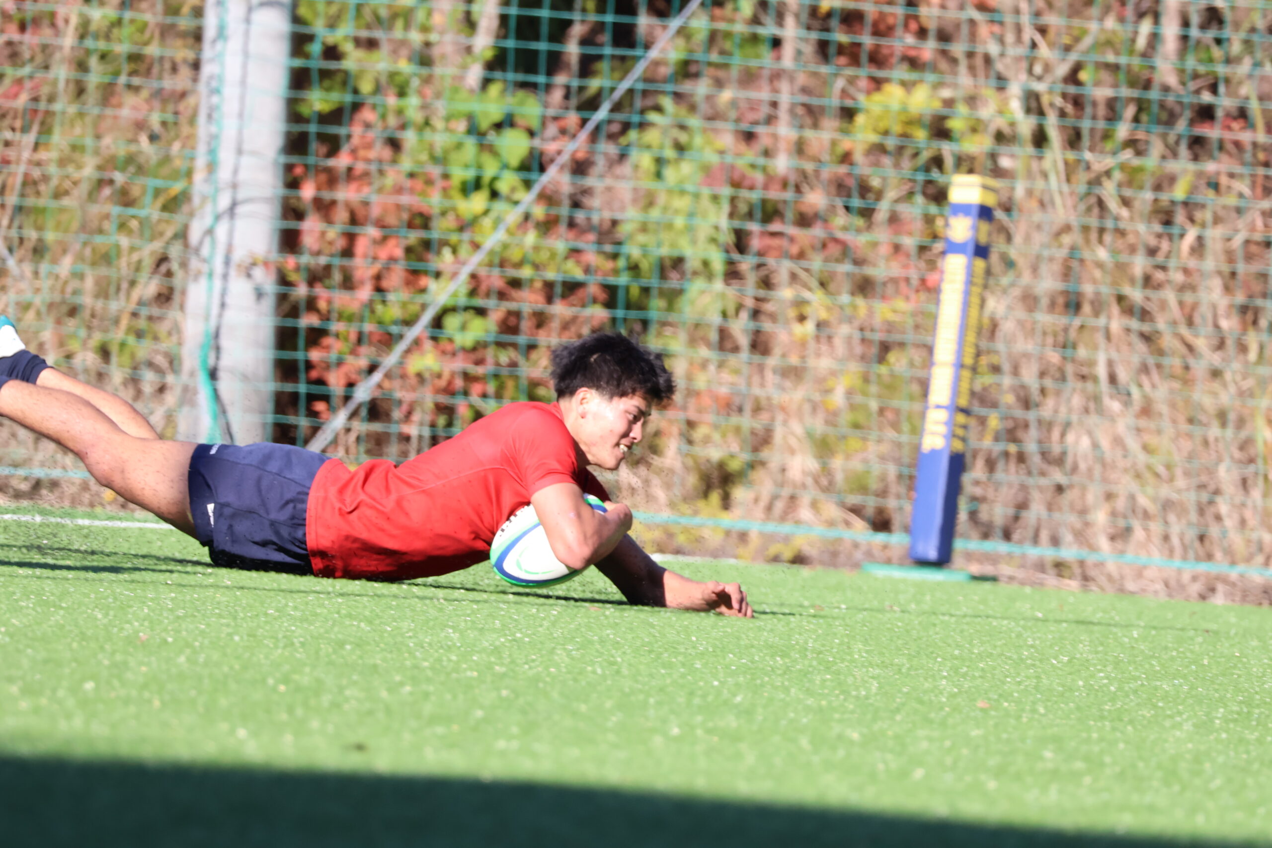 後半34分、スクラムからバックスが展開し、22 木田が相手に掴まれながらも粘ってトライ!